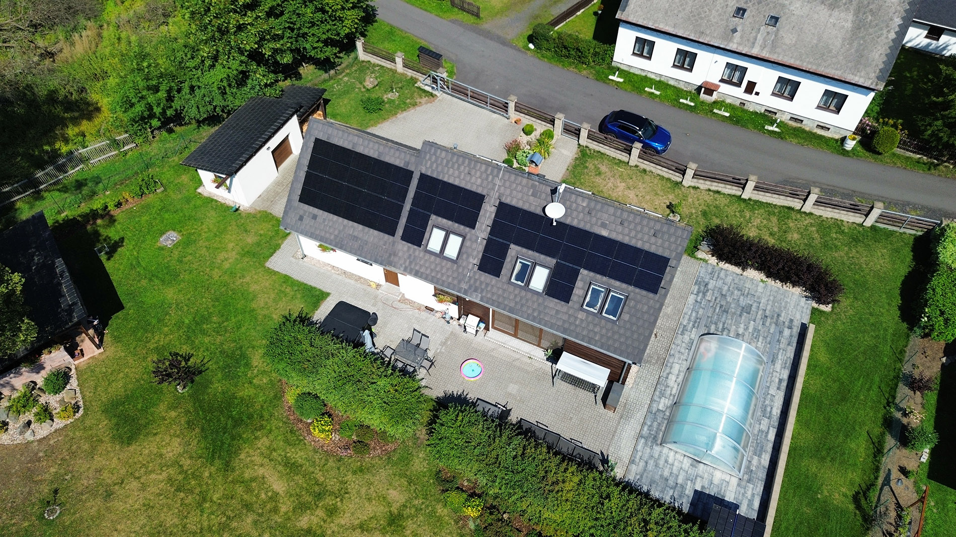 Fotovoltaická elektrárna 9,43 kWp s bateriovým úložištěm 10,24 kWh + 11 kW dobíjecí stanice Thor